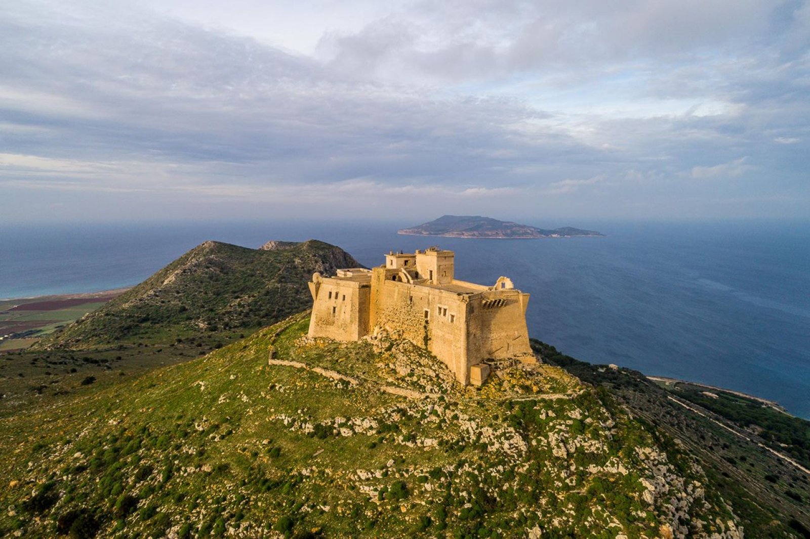 Il Castello di Santa Caterina si trova sul colle di Santa Caterina, da cui il castello prende il nome ed è il punto più alto dell’isola a 310 metri di altezza. Fu costruito su di una preesistente torre di avvistamento innalzata nel IX sec. dai Saraceni, per poi essere trasformata in un fortino dai Normanni ed ampliato da Andrea Riccio, signore dell’isola, nel XV secolo. Anche se lo stesso versa in uno stato di semi abbandono, il sito rimane comunque uno dei luoghi simbolo di Favignana, da cui è possibile godere di una vista mozzafiato. Il castello di S. Caterina fu eretto in pietra calcarea locale a forma rettangolare con sporgenze simmetriche ai quattro angoli. Il piano terra era infossato nella roccia e fu qui che, a partire dal XVII secolo, languirono i prigionieri politici. Il primo piano era costituito da locali probabilmente di alloggio per la guarnigione e sovrastato dalla terrazza di avvistamento. Un piccolo fossato correva lungo la facciata e l’ingresso era possibile attraverso un ponte levatoio. La luce all’interno del castello penetrava attraverso un gran numero di finestre ogivali, feritoie, spiragli e buche. Sull’estremità dello stipite destro della porta d’ingresso del castello era collocato uno stemma che certamente si riferiva alla casata aragonese; sotto lo stemma vi era un’iscrizione in spagnolo, che certificava che il castello venne rifortificato nel 1616. Nel piano superiore del castello vi erano una serie di stanze a volta basse e ormai in macerie che dovevano appartenere agli ufficiali e ai soldati. Vi era anche una cappella intitolata a S. Caterina dove il prete officiava la messa per i detenuti.
