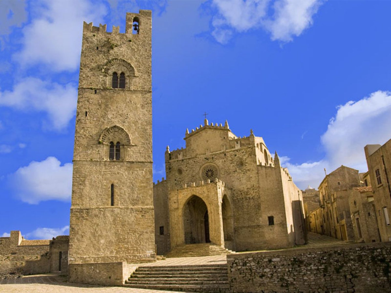 Il Duomo venne eretto nel 1312 da Federico III d'Aragona prima di ritornare a Palermo, come ringraziamento alla città che lo aveva ospitato in un momento di crisi politica. Per la sua costruzione venne utilizzato anche del materiale proveniente dal tempio di Venere, infatti nella parete esterna, lato sud della chiesa, si possono ammirare le nove formelle di pietra, a forma di croce, provenienti dal tempio. Al suo interno la chiesa è di una bellezza abbagliante, ricoperta da un candido merletto bianco in stile neo-gotico. Successivamente la facciata fu completata con un elegante rosone e uno splendido portico. Il portale esterno, di ispirazione catalana, con un pregevole rosone, è decorato con bugne a diamante, ed è sormontato da una caratteristica finestra. Una cupola mammelliforme sormonta la costruzione. L'interno della chiesa è di tipo basilicale a tre navate, delimitate da due lunghi filari di alti pilastri di tufo calcareo, sui quali poggiano degli archi ogivali. Nove croci greche in marmo fissate alla parete sud, provenienti dal tempio di Venere Ericina, furono ivi incastrate per volontà dell’arciprete Vito Carvini nel 1685: una lastra murata ne spiega origini e finalità, con aggiunta di indulgenze papali, che erano concesse a quanti partecipassero agli osanna a Maria, distogliendosi dalle pratiche in omaggio a Venere, ancora usuali sino al XV secolo. Il rosone, non originale, sostituì recentemente il remoto lastrone rotondo a tripla feritoia - pure surrogato di un altro anteriore - ed è affiancato da due oculi elaborati a canestro. Il portale, a doppia ghiera seghettata, rientra nei modi dell’architettura chiaramontana. Sul fianco settentrionale vi è portale catalano, ornato con bugne a diamante. Al versante orientale, sulla piazzetta, è addossato un altare del 1852, con una croce incorniciata finemente di tufo: vi si celebrava il rito prepasquale della benedizione delle palme. Al suo fianco svetta la Torre di Re Federico, probabilmente costruita sopra un'antica torre d’avvistamento militare del periodo punico. Salire i sui 110 scalini per ammirate Erice dall’alto sarà una piccola fatica, ma ricompensata da uno spettacolo emozionante!